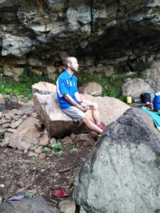 Pilgrims flock from all over the world, etching there names in the rock, collecting the water that springs forth, and praying as they look out into the beauty of nature. Walking down from the overlook to the cave of the holy springs, we passed curious villagers carrying water on their head, walking up the mountain, or enjoying some family time. The kind people here seem to be overcome by joy with a simple, “Hi. How are you?” to which the answer is always, “Fine.” Hiking loose rocks, admiring banana trees, and listening to the sounds of life bring a vastness to the experience.